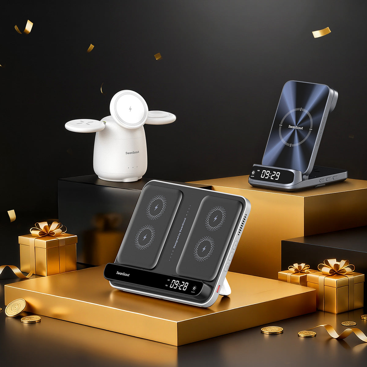 SwanScout 708SM - 3 в 1 магнитно безжично зарядно за Samsung с часовник