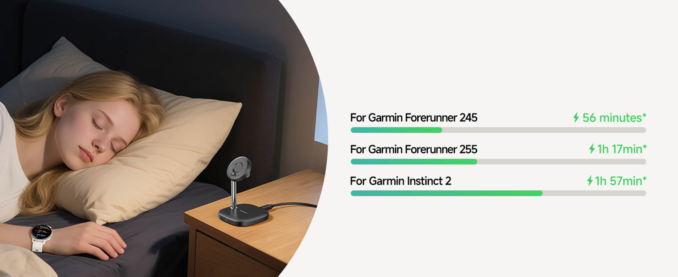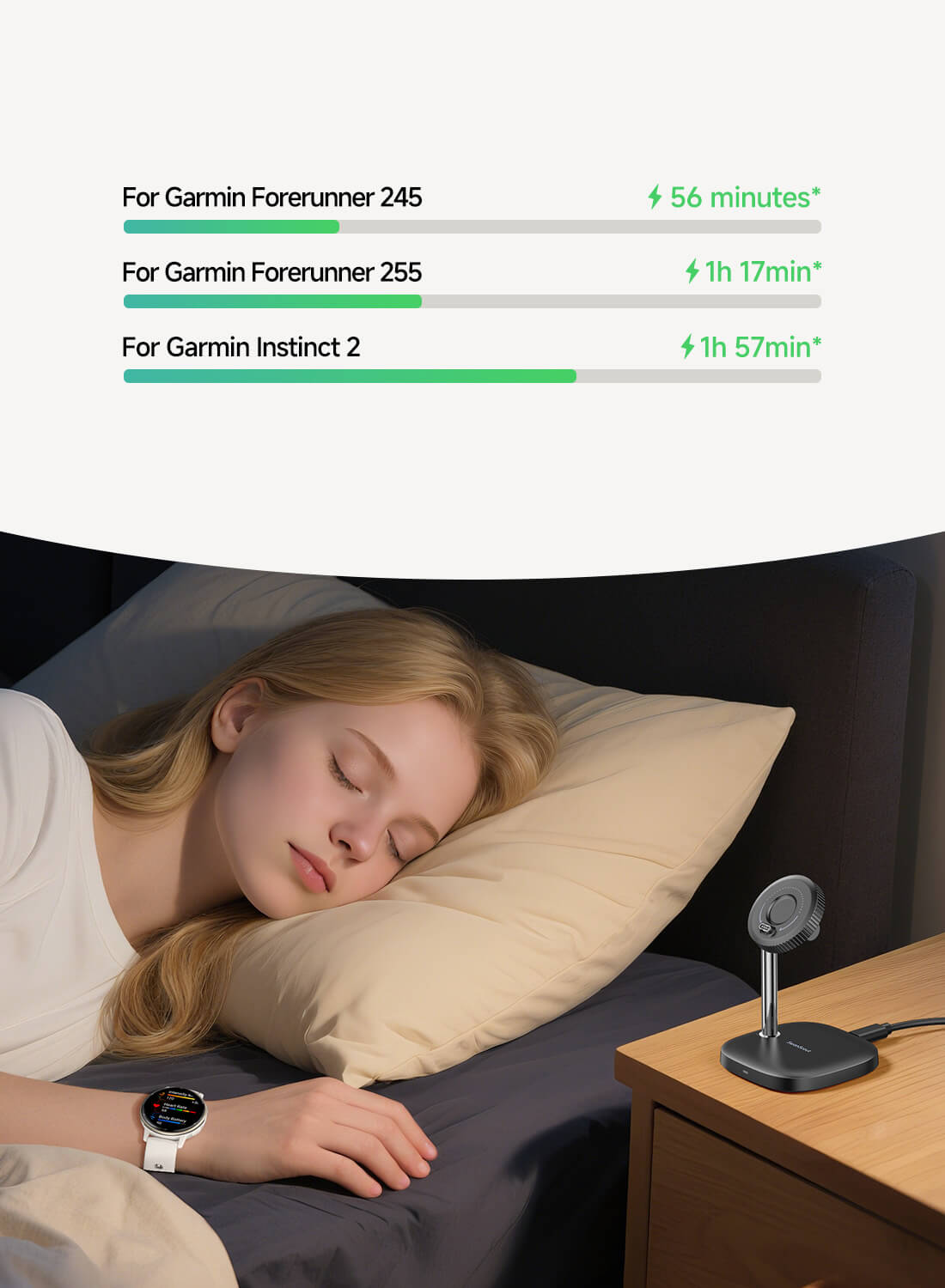 • Високоефективно зареждане с 3W – зарежда Garmin Forerunner 245 от 0% до 100% за 56 минути.