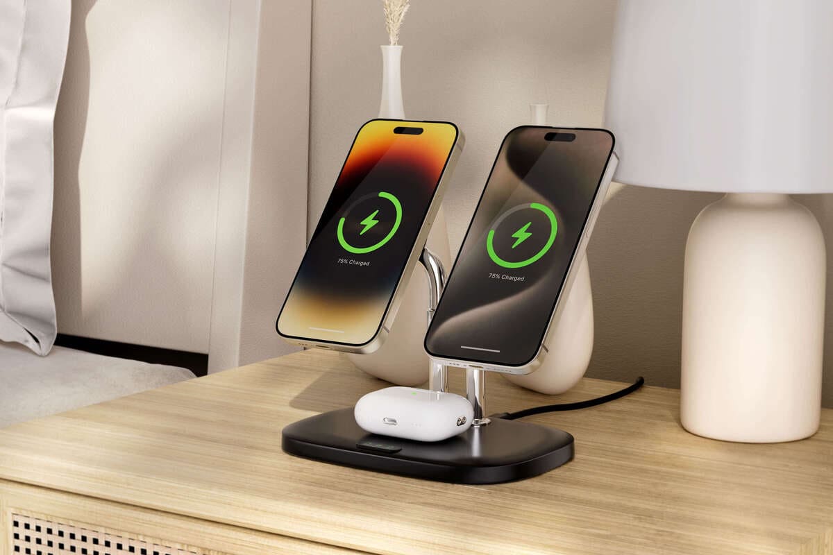 Ušetřete 20% SwanScout 706M black 3-in-1 magnetic charging station, simultaneously powering two iPhones with MagSafe compatibility and AirPods.White SwanScout 706M magnetic wireless charger, supporting dual iPhone 16/15 series charging with an integrated 3.5W earbuds pad.