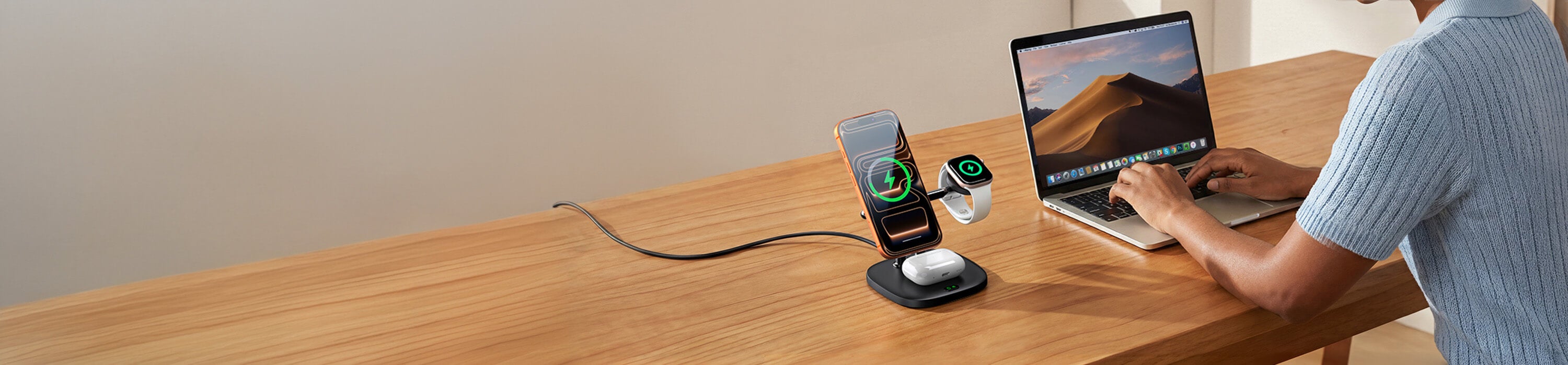 Ušetřete 20% SwanScout 901M 5-in-1 magnetic charging station with 60W output, simultaneously powering iPhone 17, Apple Watch 10, AirPods, and an iPad.The SwanScout 901M organized on a study desk, featuring 5W fast charging for Apple Watch and a dedicated dock for tablets or Nintendo Switch.