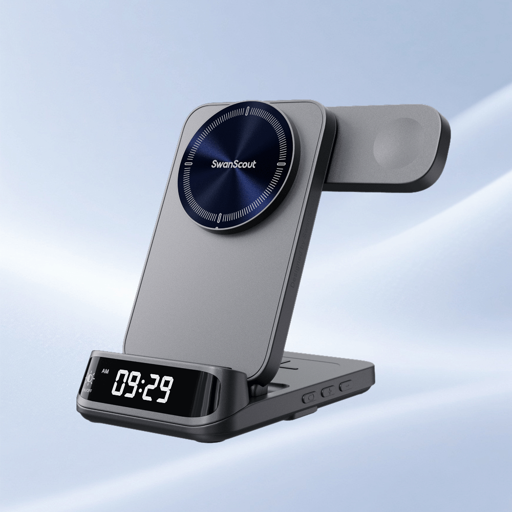 SwanScout 502M is a slim, 2-in-1 magnetic wireless charger compatible with Apple devices.The SwanScout 502M combines a sleek 2 in one clock phone charger design with an LED display and fast charging for daily convenience.