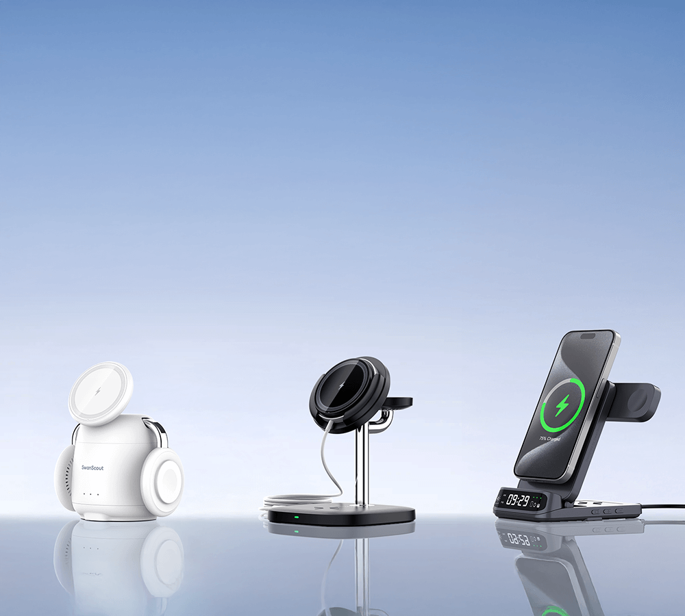 SwanScout 304M is a sleek iPhone charging station that simplifies power management for daily Apple device users.With iPhone wireless charger fast charging, the SwanScout 304M delivers quick, reliable energy without overheating.