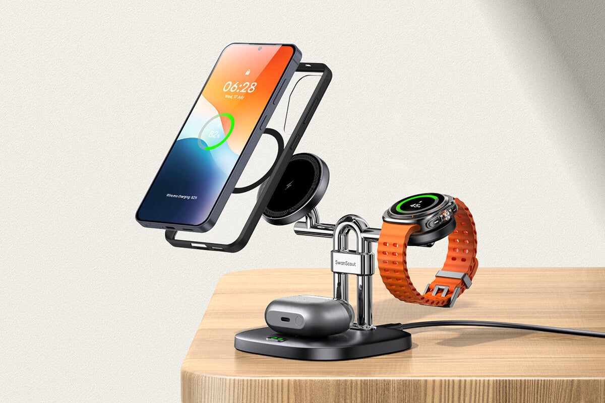 Säästä 20% SwanScout 901M 5-in-1 magnetic charging station with 60W output, simultaneously powering iPhone 17, Apple Watch 10, AirPods, and an iPad.The SwanScout 901M organized on a study desk, featuring 5W fast charging for Apple Watch and a dedicated dock for tablets or Nintendo Switch.
