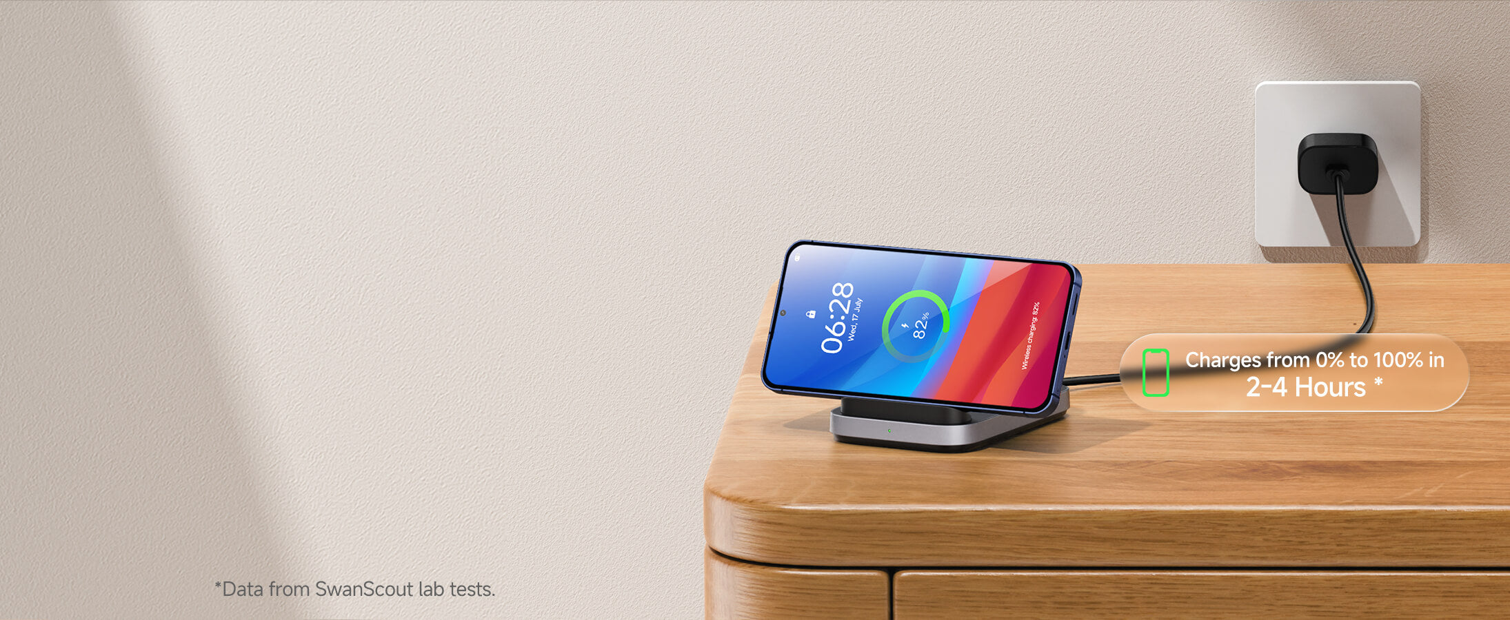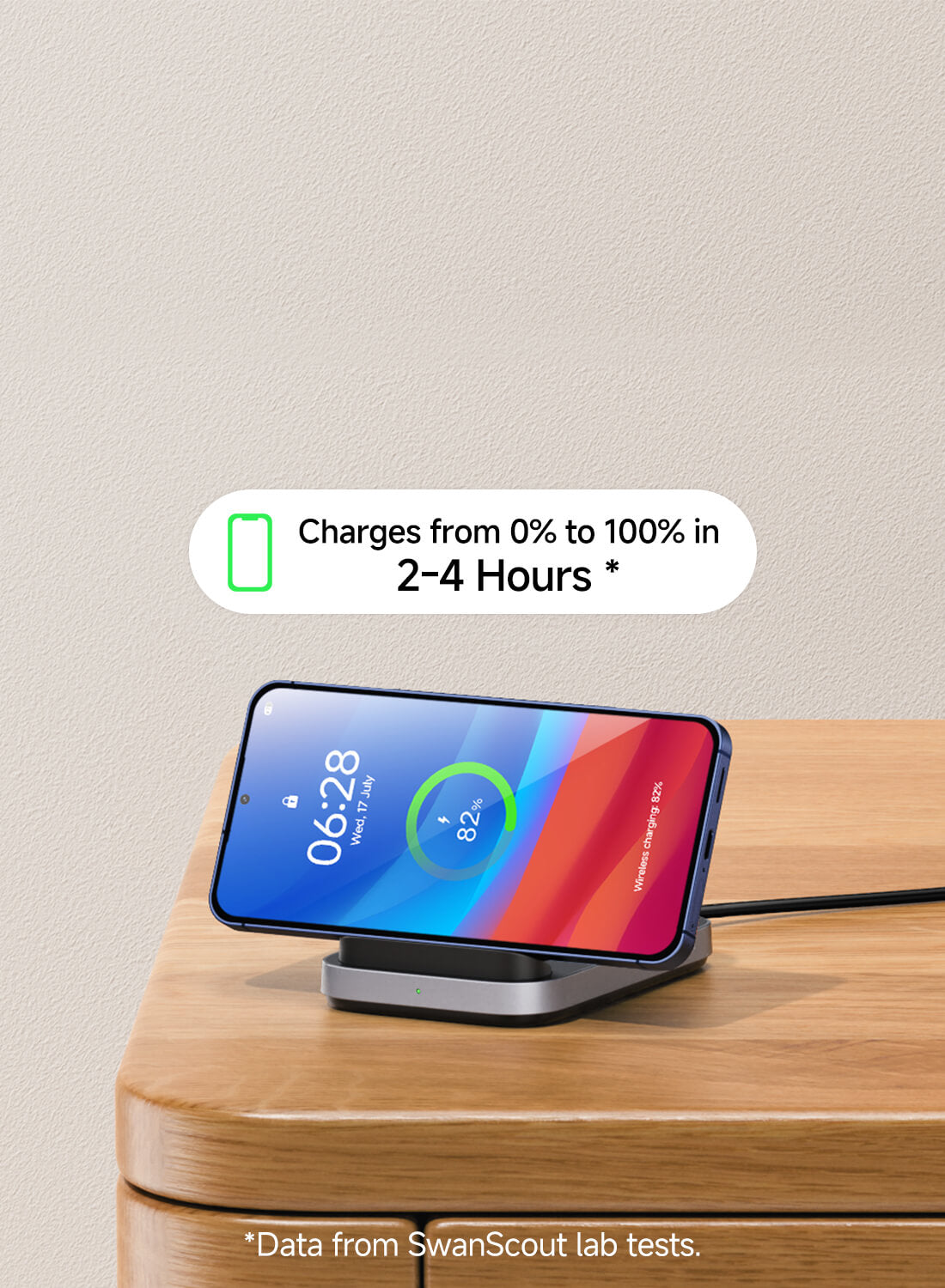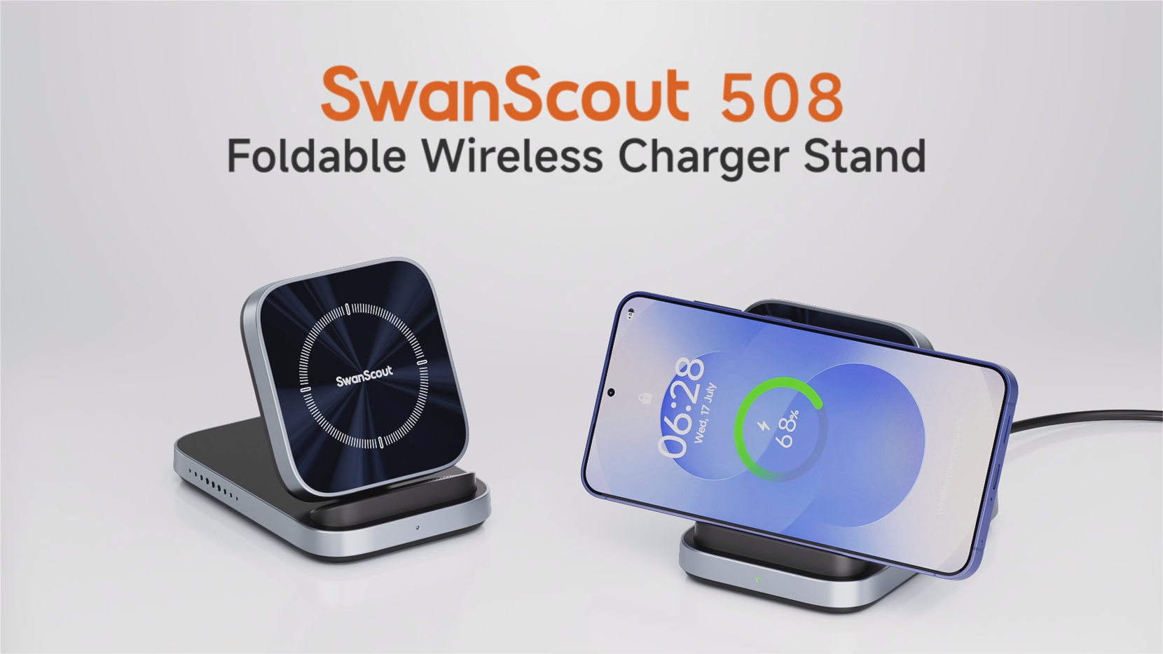 Vezeték nélküli töltőállvány Samsung Galaxy S25 Ultra/S25/S24/S23 készülékekhez, iPhone 17/Air/16/15/14/13/12 modellekhez, Google Pixel 9/9a/8/7/6 készülékekhez, csak vízszintes töltéshez, SwanScout 508 (Adapter nélkül)