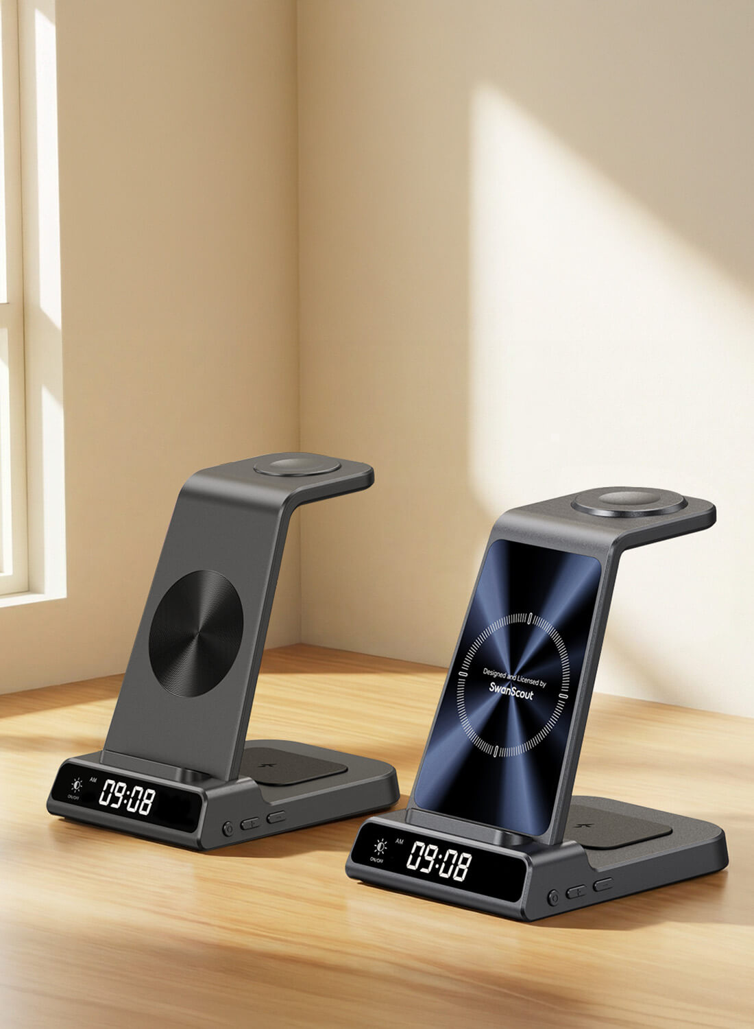 The SwanScout C02 acts as an elegant Apple wireless charger, perfect for multi-device setups.