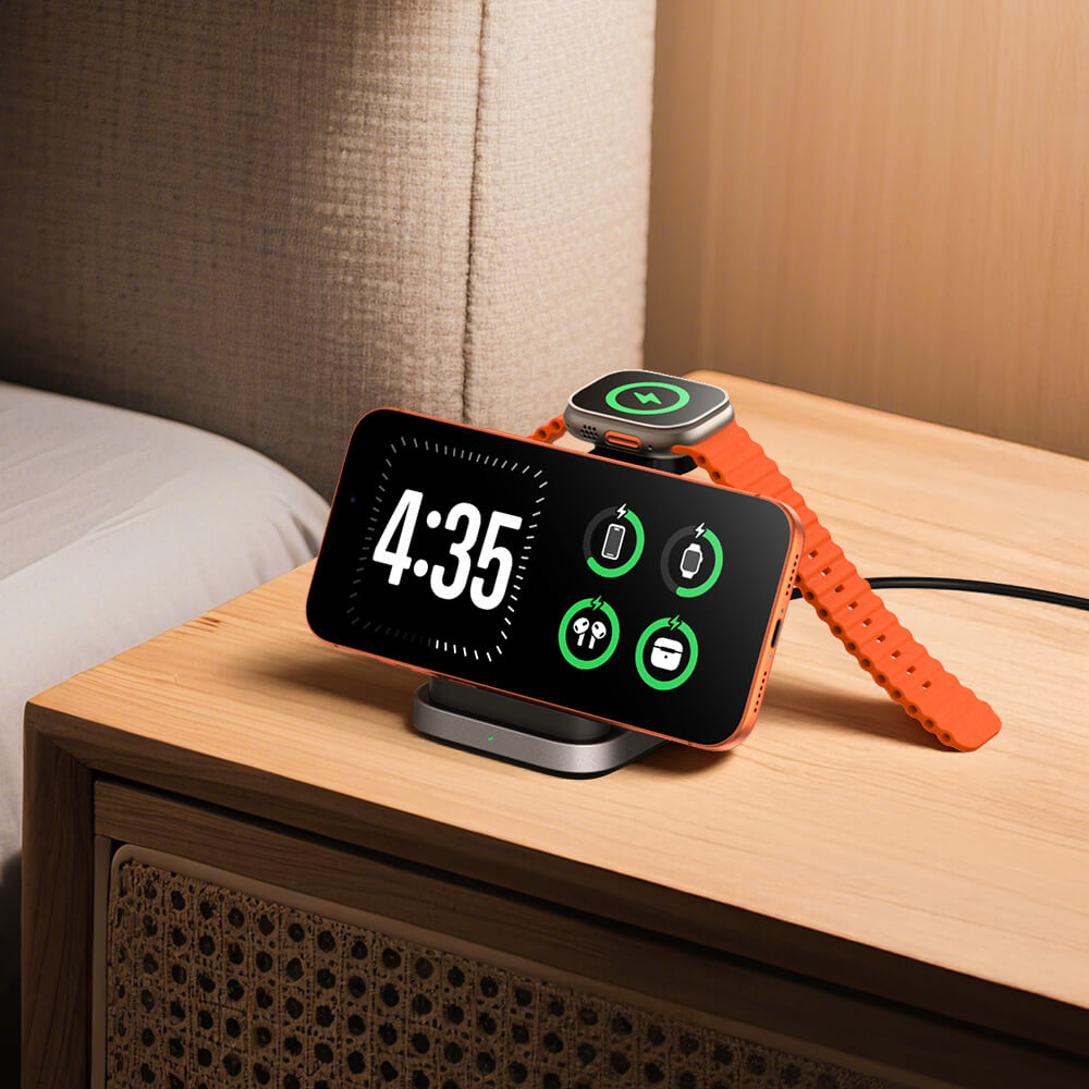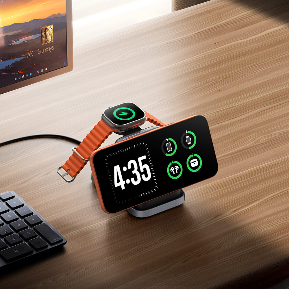 • 3-in-1 Charging: Wirelessly charge your iPhone, AirPods, and Apple Watch at the same time.
