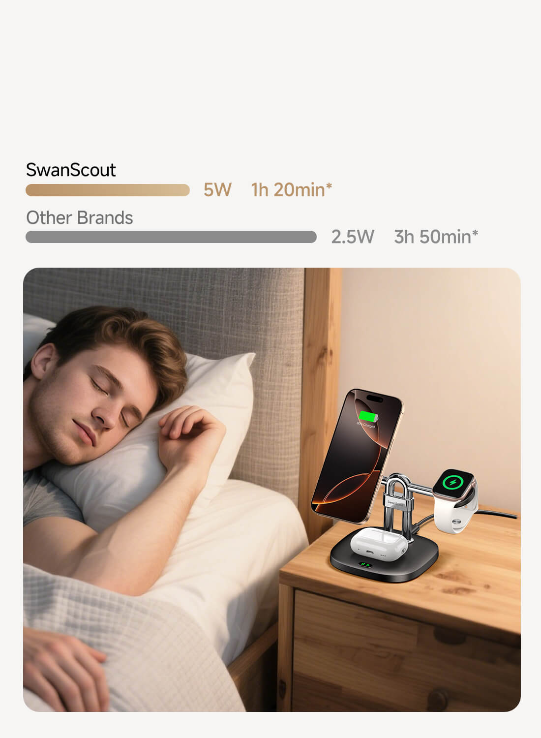 • Desfrute de carregamento rápido de 5W para Apple Watch, atingindo 80% em apenas 51 minutos — 47% mais rápido do que os carregadores padrão de 2,5W.