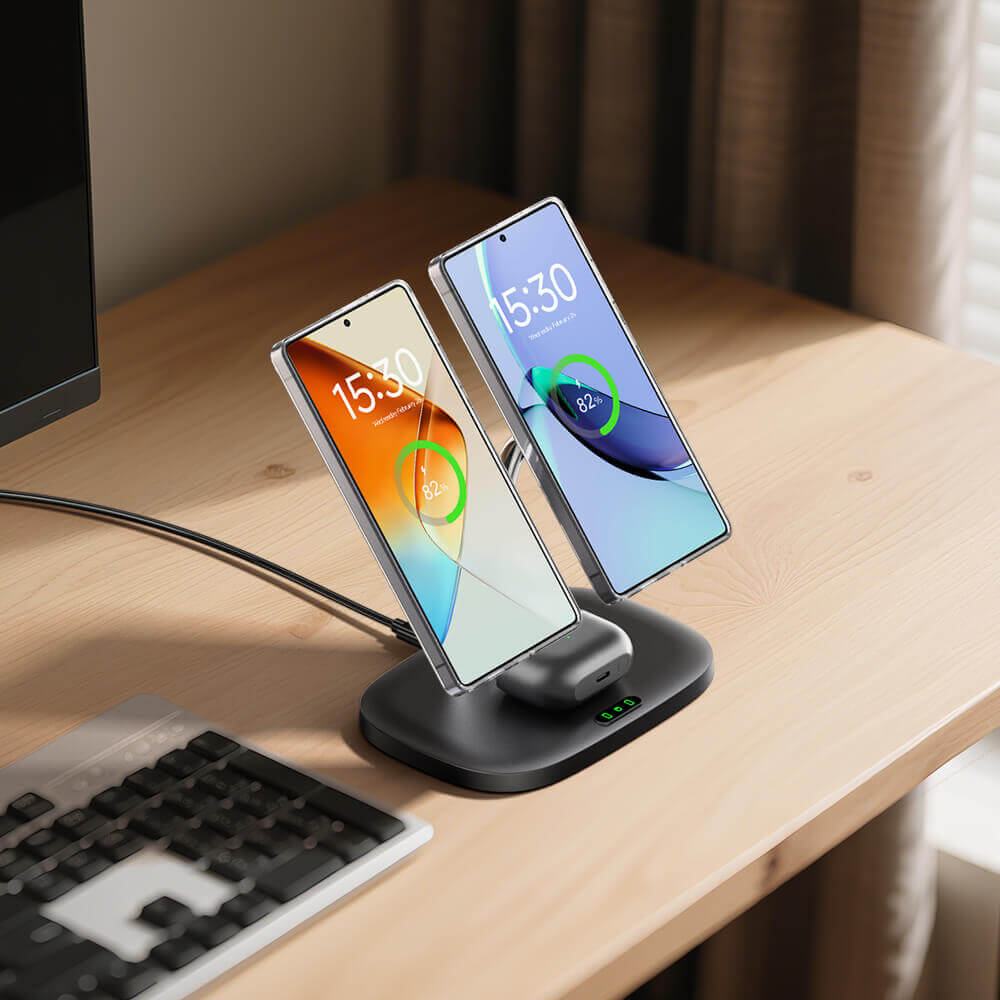 • Încărcare magnetică dublă: Încarcă simultan două telefoane cu magneți puternici, ideal pentru cupluri, utilizatori cu mai multe dispozitive sau oricine gestionează telefoane personale și de serviciu.
