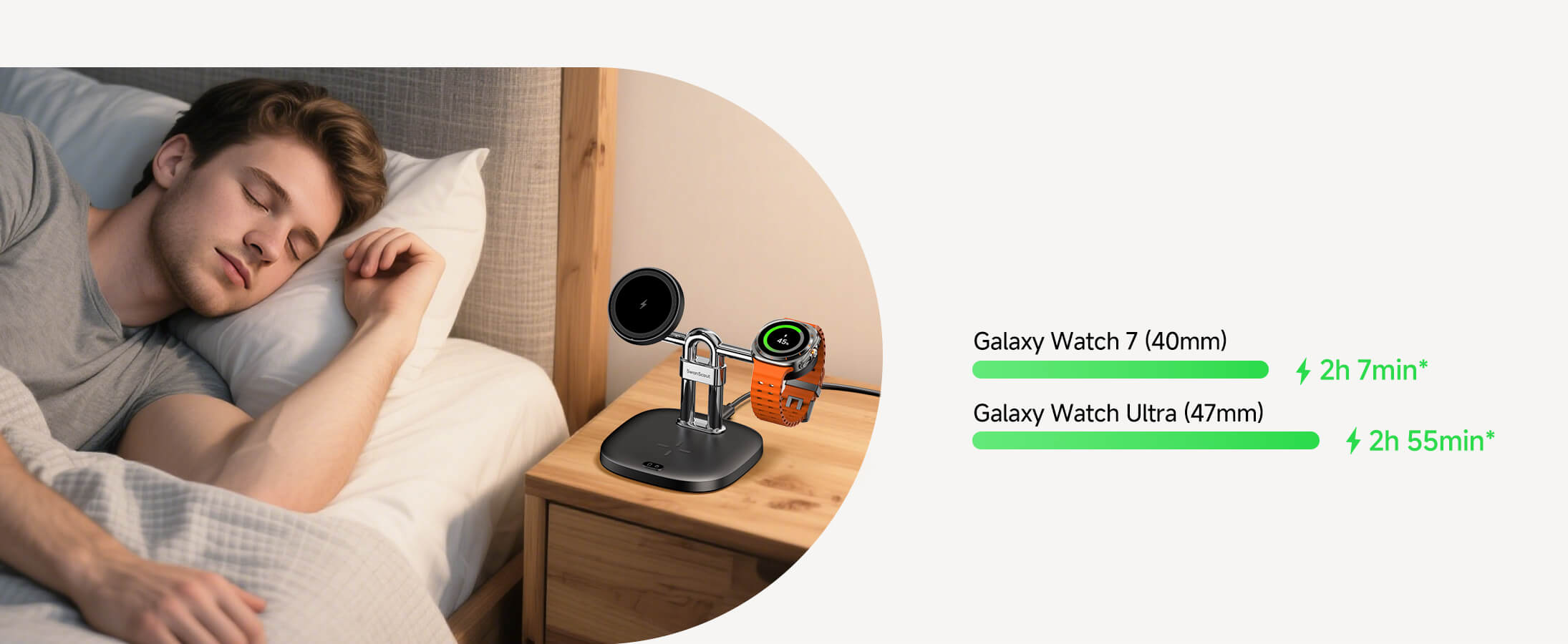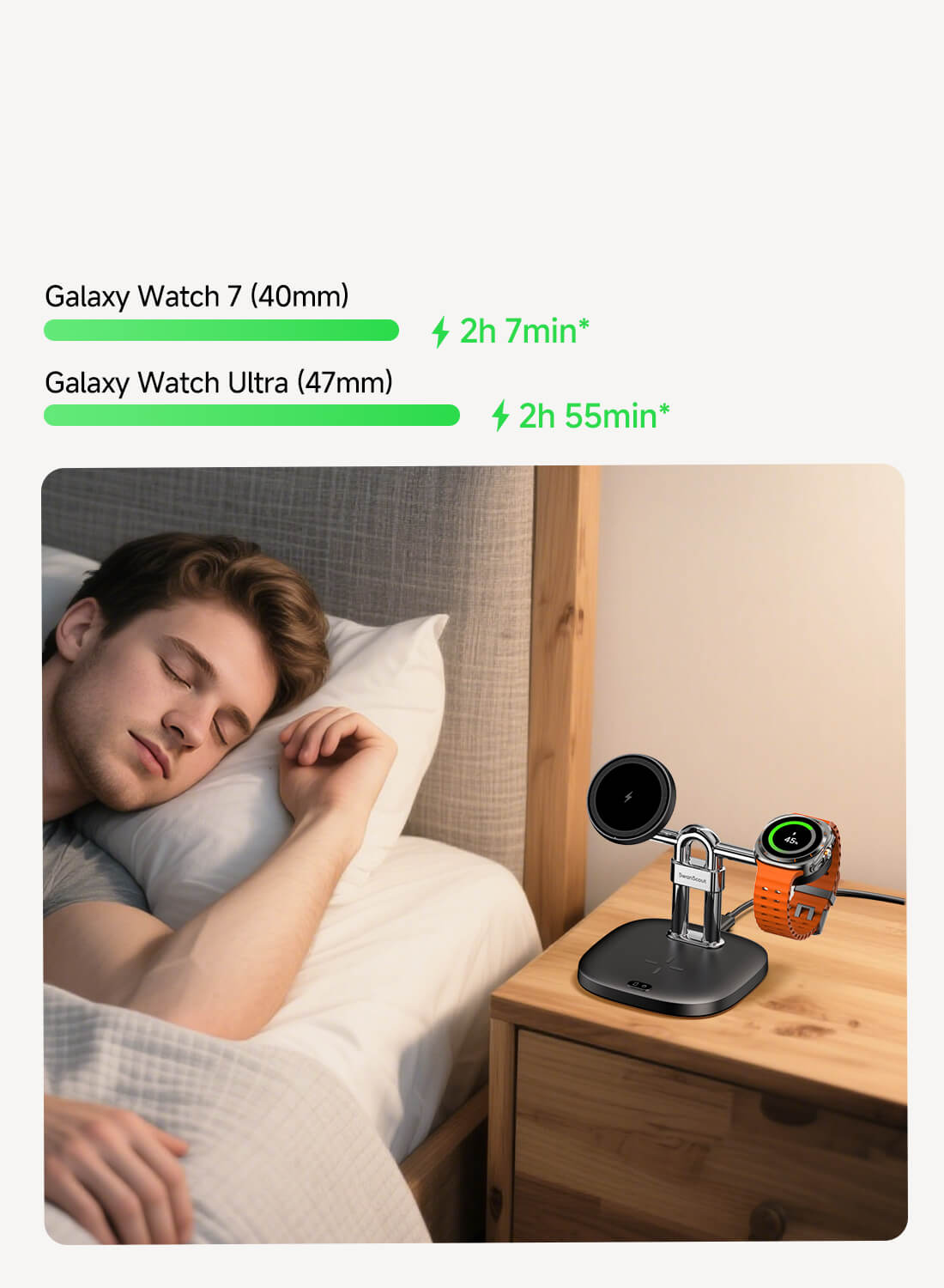 - 3-i-1 magnetisk laddning: Laddar Galaxy-telefon (magnetiskt skal krävs), Watch och hörlurar samtidigt. Kräver 20W+ PD-adapter (ingår ej).